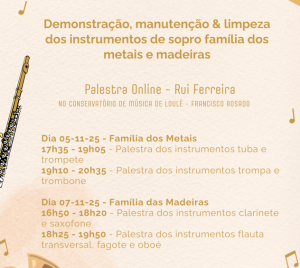 Palestras online de demonstração, manutenção & limpeza dos instrumentos de sopro, família dos metais. Estas sessões pretendem elucidar os participantes sobre a importância da manutenção e limpeza do instrumento musical, assim como mostrar as vantagens, a curto e longo prazo, …