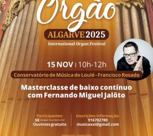 Masterclass de Baixo Contínuo com Fernando Miguel Jalôto, no âmbito da programação do Festival Internacional de Órgão do Algarve 2025. Para inscrição e mais informações consultar o cartaz em anexo.