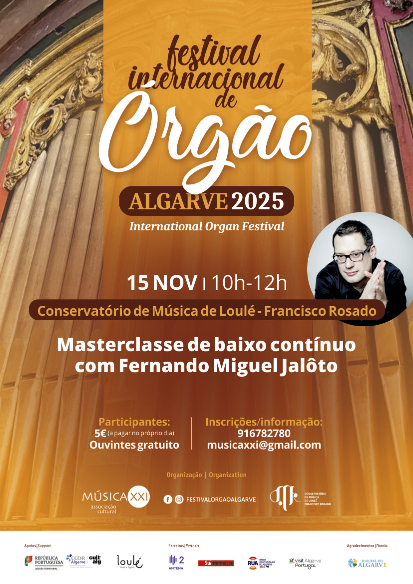 Masterclass de Baixo Contínuo com Fernando Miguel Jalôto, no âmbito da programação do Festival Internacional de Órgão do Algarve 2025. Para inscrição e mais informações consultar o cartaz em anexo.