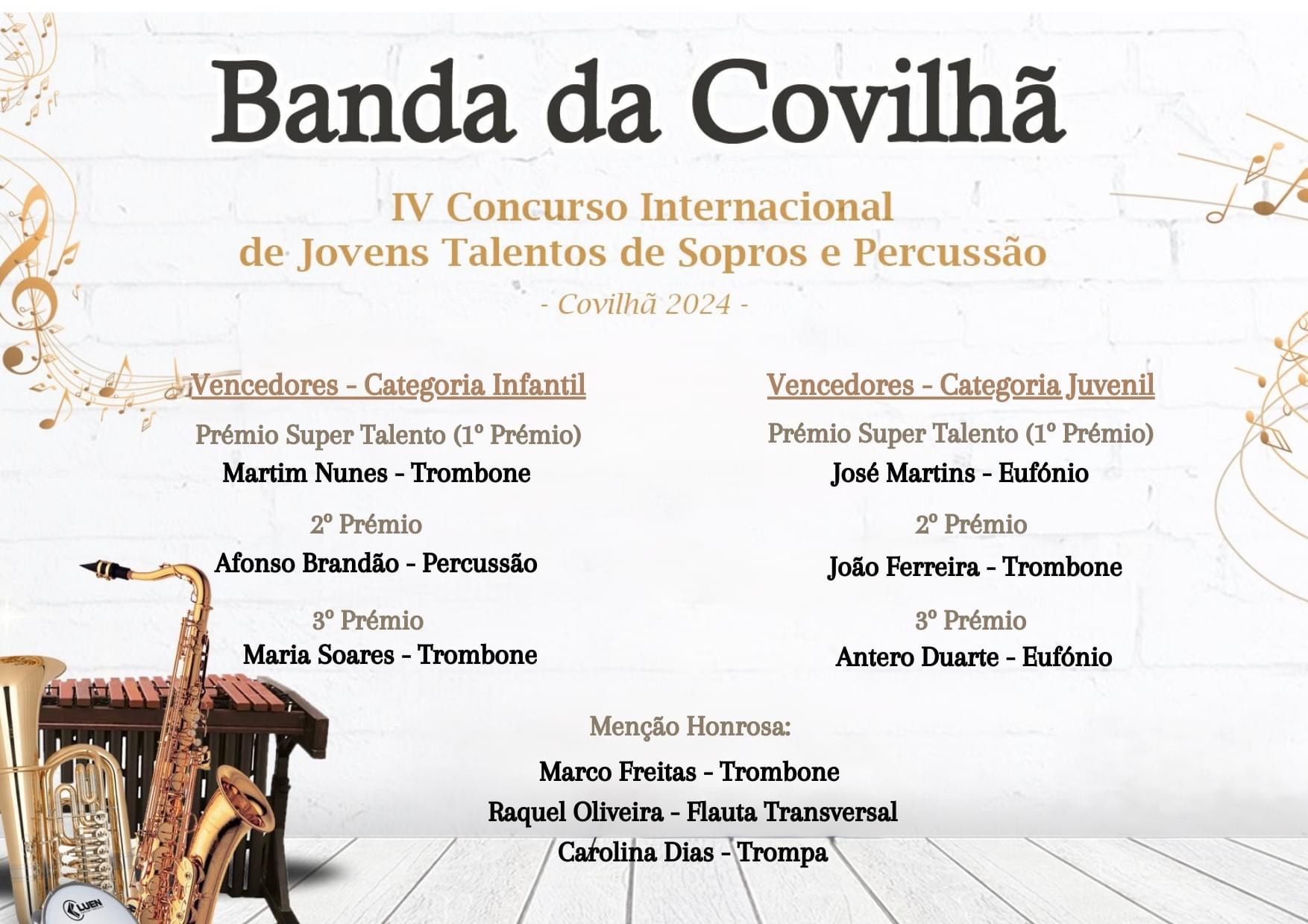 É com muito gosto que informamos a nossa comunidade educativa que o aluno Antero Duarte, do 6.º ano/2.º grau, Eufónio, obteve o 3.º prémio na categoria Juvenil, no IV Concurso Internacional de Jovens Talentos de Sopros e Percussão, que teve lugar na Covilhã.
