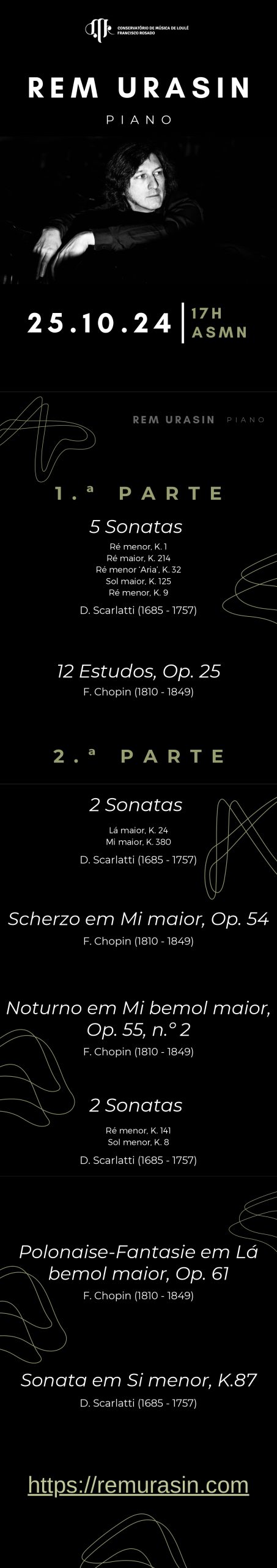 Foi no passado dia 25 de outubro que Rem Urasin (um reconhecido pianista de nacionalidade russa, especialista na interpretação das obras de Chopin) brindou a comunidade educativa do Conservatório de Música de Loulé – Francisco Rosado com um concerto, cujo programa se anexa.