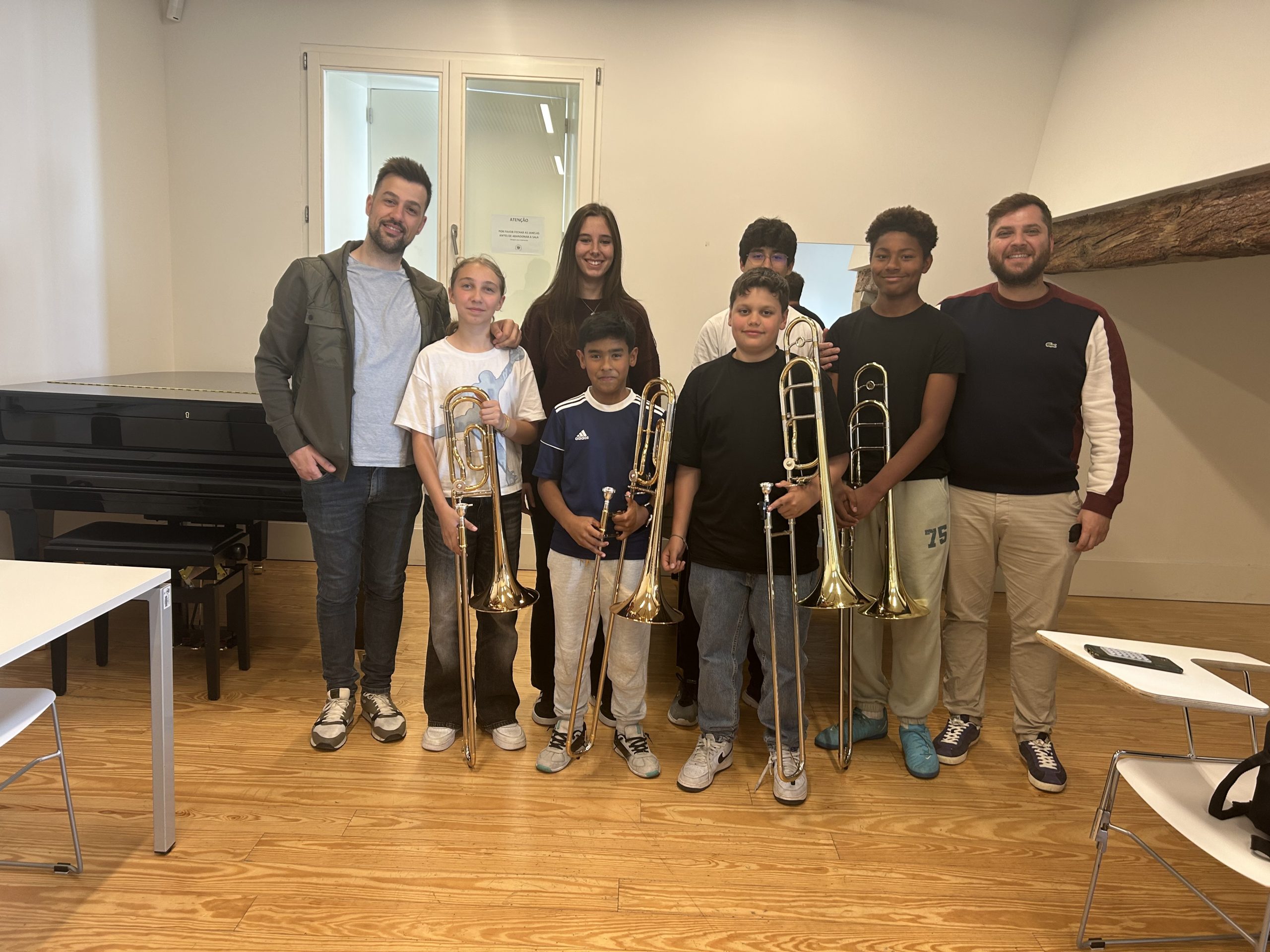 Durante a tarde, os alunos do ensino básico de trombone mergulharam num ambiente de reflexão prática e diálogo, explorando novas formas de abordar o repertório contemporâneo e o seu impacto no ensino do instrumento. Através de obras atuais de compositores portugueses e experiências pedagógicas enriquecedoras, foram apresentadas estratégias que fomentam não só a evolução técnica, mas também a criatividade e expressividade musical dos participantes.