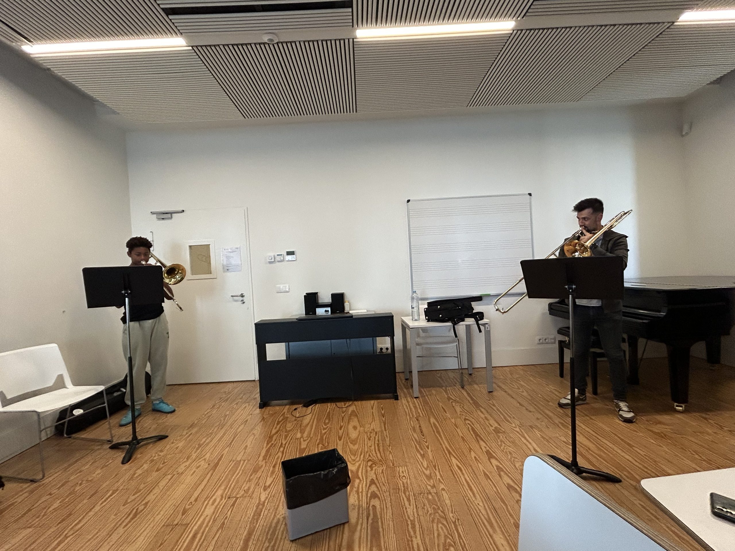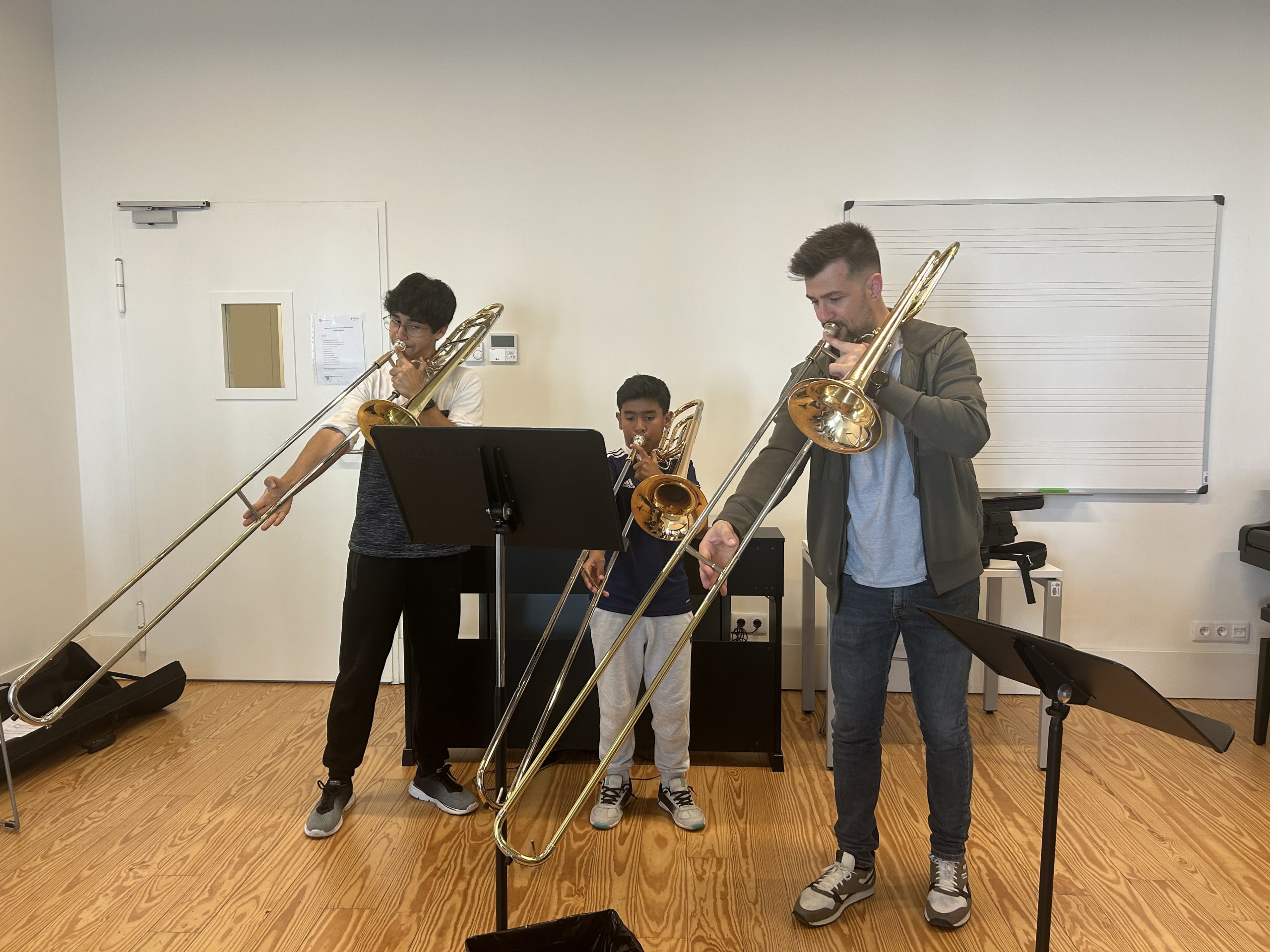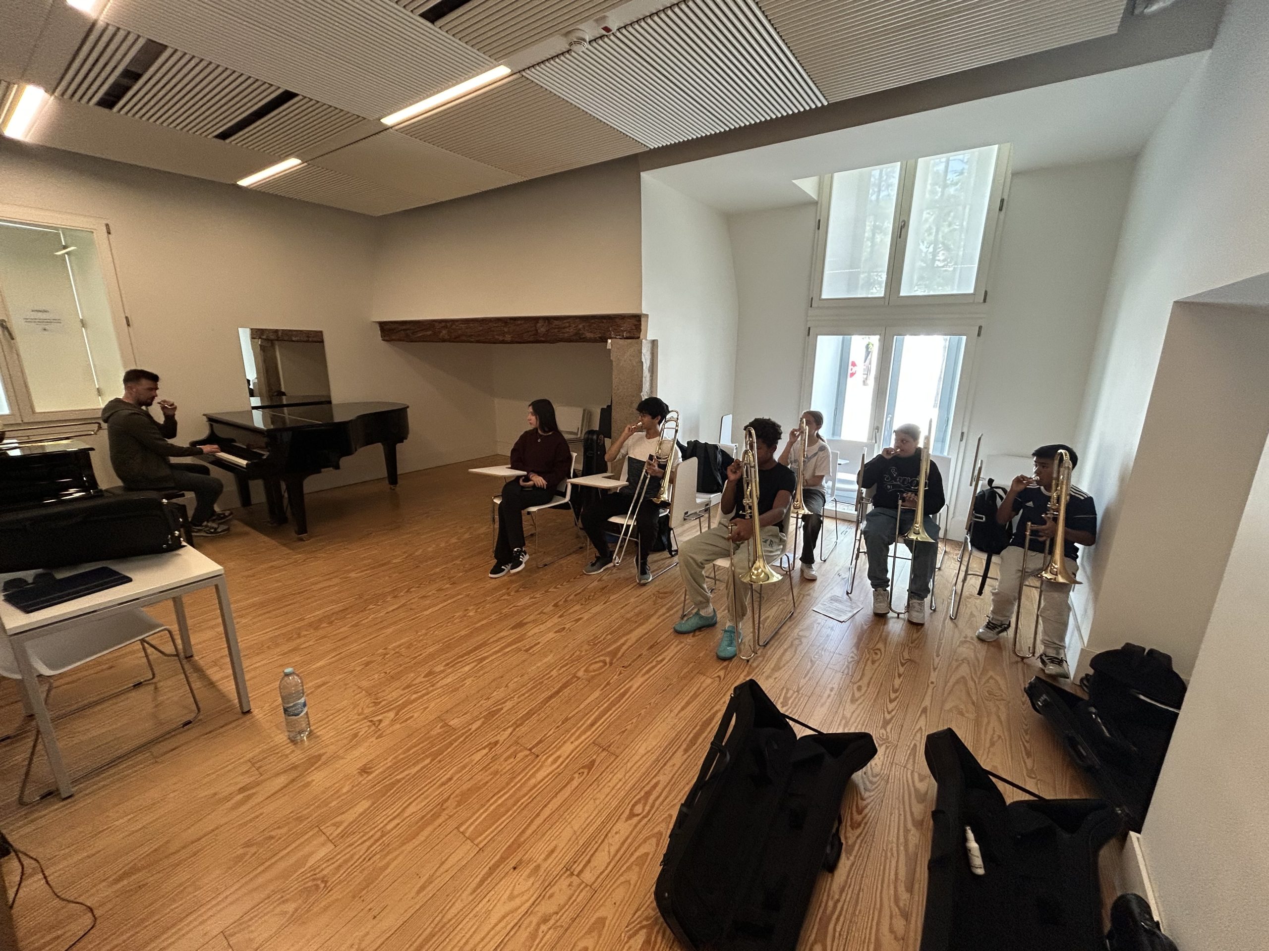 Durante a tarde, os alunos do ensino básico de trombone mergulharam num ambiente de reflexão prática e diálogo, explorando novas formas de abordar o repertório contemporâneo e o seu impacto no ensino do instrumento. Através de obras atuais de compositores portugueses e experiências pedagógicas enriquecedoras, foram apresentadas estratégias que fomentam não só a evolução técnica, mas também a criatividade e expressividade musical dos participantes.