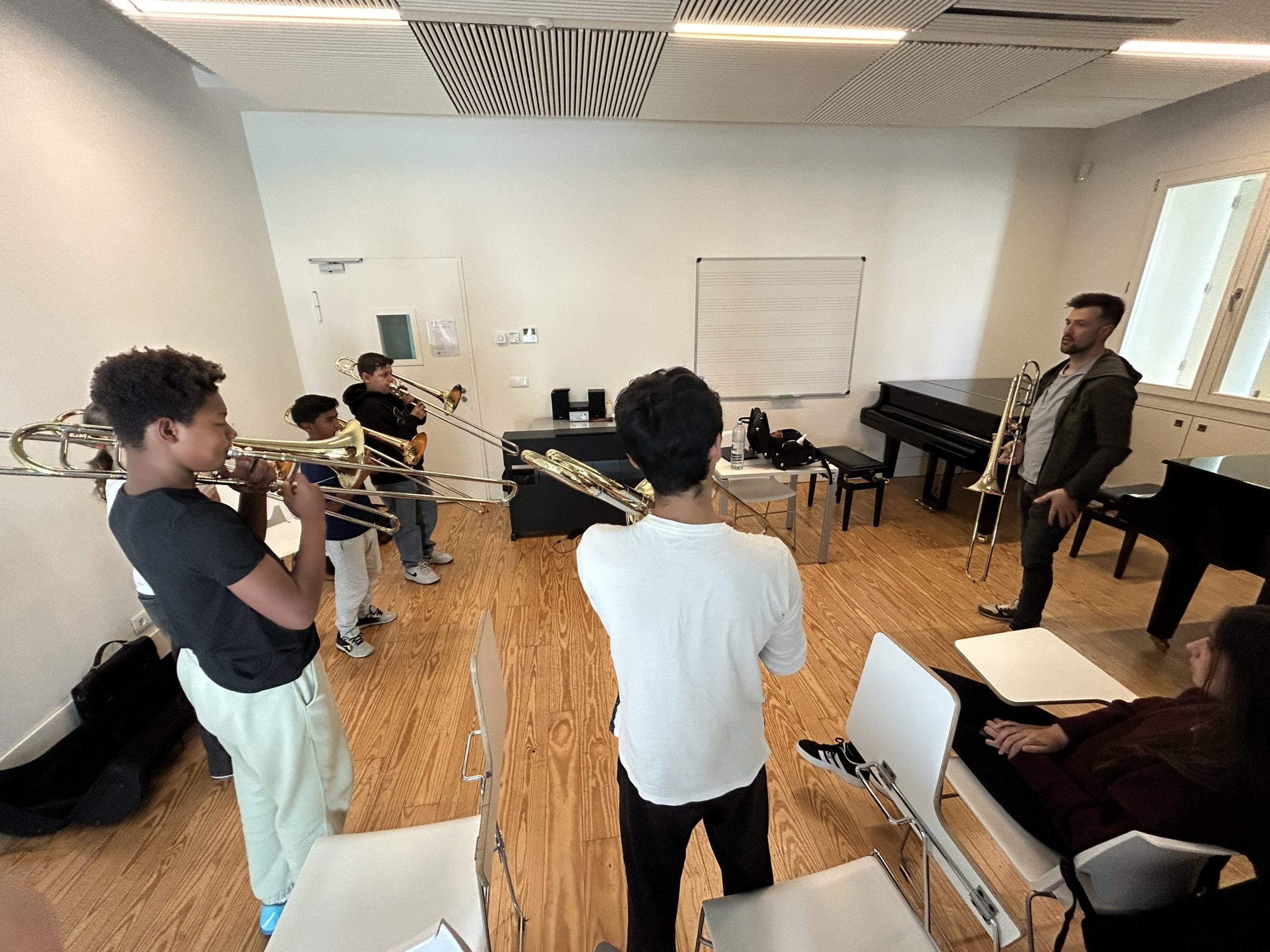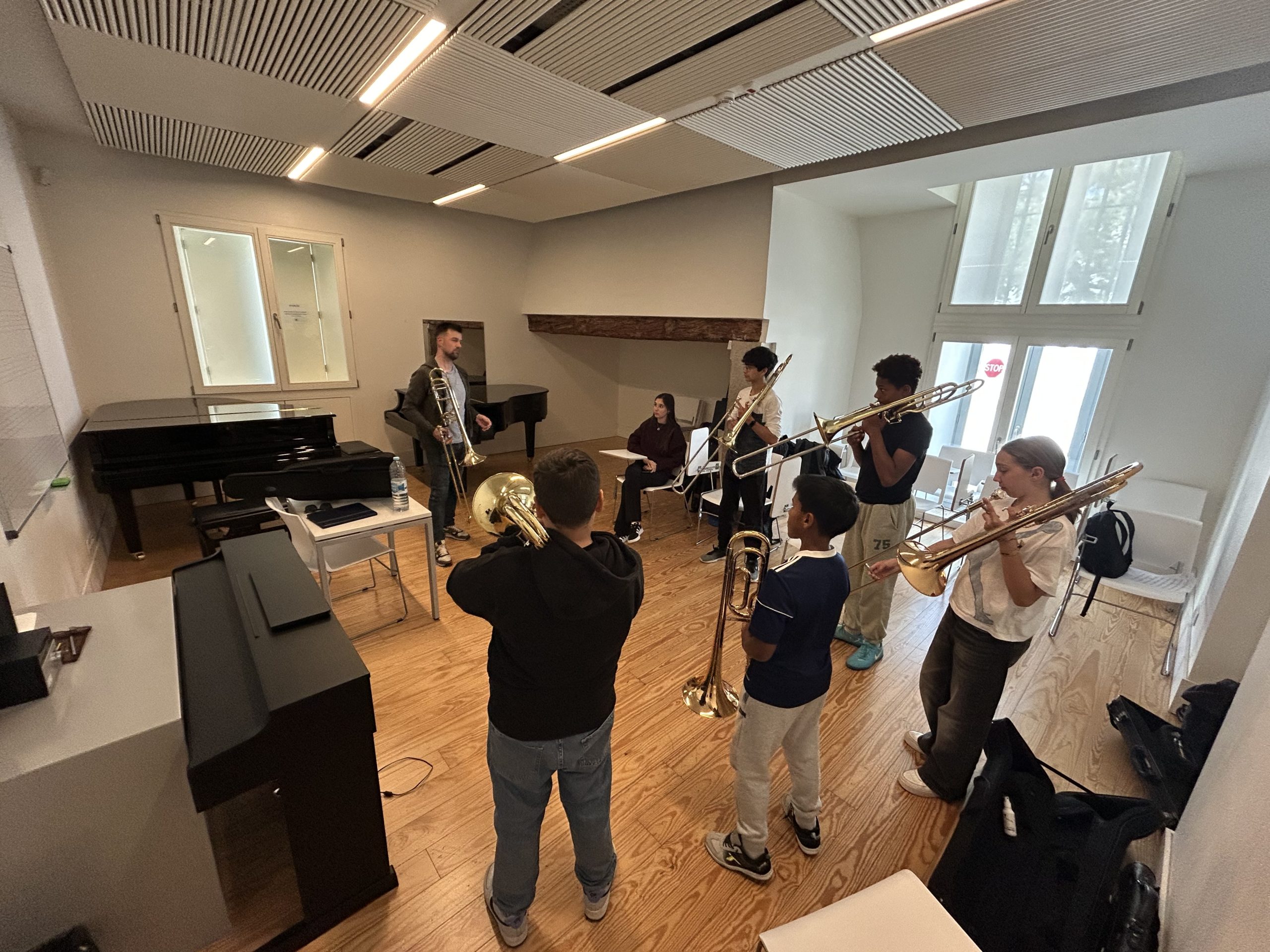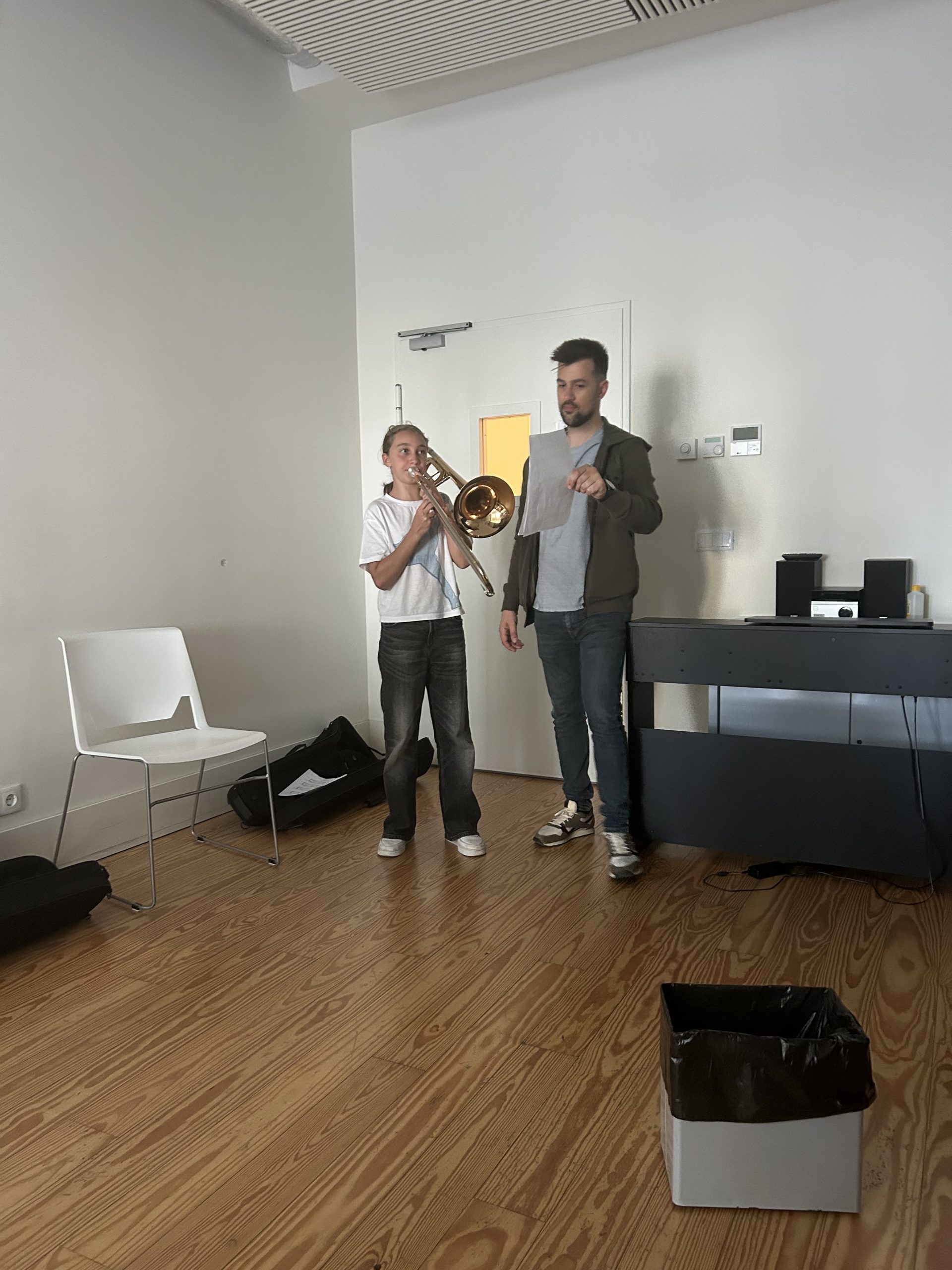 Durante a tarde, os alunos do ensino básico de trombone mergulharam num ambiente de reflexão prática e diálogo, explorando novas formas de abordar o repertório contemporâneo e o seu impacto no ensino do instrumento. Através de obras atuais de compositores portugueses e experiências pedagógicas enriquecedoras, foram apresentadas estratégias que fomentam não só a evolução técnica, mas também a criatividade e expressividade musical dos participantes.